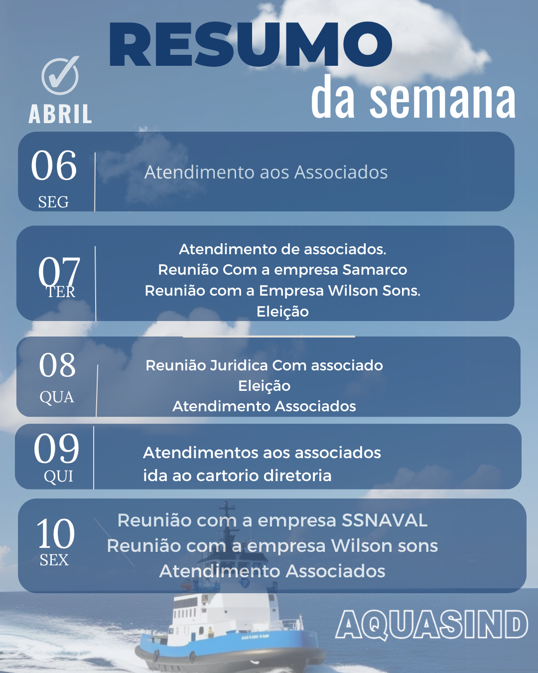 Aqui você encontra, toda semana, um resumo com as principais notícias, atividades, avisos e comunicados oficiais do AQUASIND. Nosso objetivo é manter você, associado, sempre bem-informado sobre tudo que acontece no setor marítimo e nas ações do sindicato.